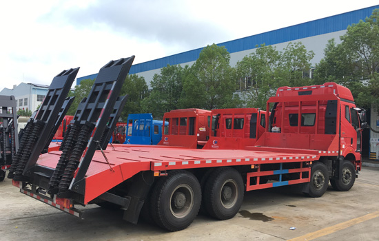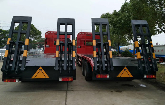 上裝配置:平板底板橫梁采用120*120*5mm方管,底板采用8mm/10mm/12mm花紋板,帶加密斜支撐,爬梯采用雙彈簧加強型設計,采用三道筋+雙彈簧加固焊接,可選裝液壓爬梯或折疊加長型液壓爬梯,斜坡處帶后支腿,平板有效板長8.9米(含斜坡),板寬2.55米(可手動伸展至3.2米寬),可以選擇貨箱帶欄板設計,35噸及以下噸位挖機首選車型!